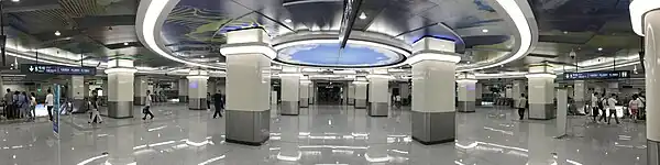 该站地下部分共有四层,其中地下一层是站厅,地下二层是1号线站台,地下三层为5号线与8号线的站台。