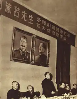 28. 郭沫若. . 《观察》. 1949年12月16日 (中文). 斯大林大元帅,你全人类的解放者,/今天是你的七十寿辰,/我向你高呼万岁!……你的七十岁已经是地质学上的年龄了,/已经是天文学上的年龄了,……你已经活了七千亿万恒河沙数地质年,/你还要活下七千亿万恒河沙数天文年。……我向你高呼万岁/元帅,/你是全人类的解放者,/今天是你的70寿辰,/我向你高呼万岁/…………/原子弹的威力在你面前只是儿戏/细菌战的威胁在你面前只是梦呓/你的光暖使南北两冰洋化为暖流/你的润泽使撒哈拉沙漠化为沃土