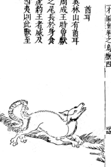 酋耳,是中国传说的妖怪,形态如老虎,尾巴和身体一样长,不会捕食活的动物,但是看到虎豹就会改变态度去袭击杀死。[1]会猎捕虎豹而食。[2]在《三才图会》中,被认为是王者威势遍及四夷之际才会出现的野兽[3]