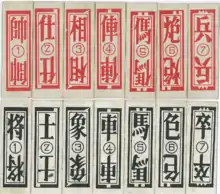 牌具形狀類同葉子戲,以牌的底色作雙門花色,有紅、白兩色,各印有中國象棋的將(帥)、士(仕)、象(相)、車(俥)、馬(傌)、包(炮)、卒(兵),其中將到卒各標有一到七數字,共十四種,每種四張,共五十六張。上下兩端則會有像水滸牌的類似標記。
