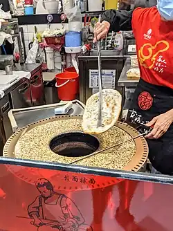 锅盔的起源有两种说法:在陕西,相傳武周(唐武則天)時期,官兵在乾县為武則天修建時,因工程鉅大,大量民工需要忙碌工作,且工地無烹調用具,所以官兵以頭盔為炊具來烙製麵餅,故取名鍋盔,后来发展为乾县锅盔[1];在四川,相传三国时期,张飞领蜀军在成都彭州军屯镇屯军时,因不善烹饪,张飞有一次烙饼烙糊了,战场上却意外地帮自己抵挡住了一次攻击,由此得名锅(烙铁)盔,后来发展为军屯锅盔。