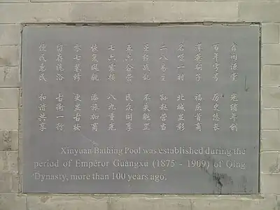 鑫园澡堂始建于清朝光绪年间,内设温、热、暖三池。此外,鑫园澡堂还负责烟袋斜街的消防。早年,烟袋斜街设有公益水会,李福庆曾经被推为该水会会长,置有会旗、铜锣、水桶、火钩、板斧等简易灭火装置,附近的商店如果失火,鑫园澡堂会鸣锣示警,聚集水会会员前去灭火。1928年,澡堂转手由孙印弘、赵炳文经营。1956年,浴池业公私合营,鑫园澡堂附设理发、搓澡、修脚等服务项目,内设温热双池。文化大革命中更名为“鼓楼浴池”,搓澡和修脚服务被取消。后因1976年唐山大地震致建筑下沉,房屋因属于危房而歇业。1985年,由西城区服务公司投资160万元,在原址拆旧建新,成为西城区首家高档浴池,建筑面积1900平方米。此即“鑫园浴池”。2007年,华利佳合公司投资460万元,历时6个月,在鑫园浴池基础上改建了客房,名为“鑫园客栈”,内外装修设计保持明清风格。位于一楼及地下的鑫园浴池继续运营,并在浴池入口处刻有碑记,简述其发展历程。[3][4][1]