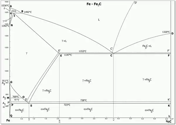 - 純鐵的熔點是1536°C;也可以看出鋼及鑄鐵在完全固化(或開始熔化)時的溫度(A-H-I-E線及E-C-F線),鑄鐵開始熔化的最低溫度是在1147°C,這也說明鑄鐵比鋼更容易用在鑄造的應用上。