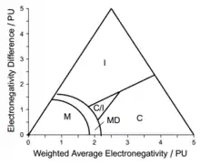 该图列的三个顶点分别代表化合物或单质的三种典型键型:金属、共价和离子,以及说明了典型键型之间有过渡物质。