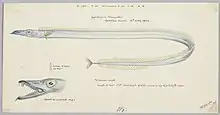 長體深海帶魚,为輻鰭魚綱鱸形目鯖亞目带鱼科的其中一種。分布於全球各大洋熱帶及亞熱帶海域,棲息深度在水深178至950公尺,本魚體銀色,顎與鰓蓋黑色,背鰭硬棘42至46枚;背鰭軟條99至108枚;臀鰭硬棘2枚;臀鰭軟條91至98枚;脊椎骨151至159個,體長可達100公分,屬肉食性,以魚類、甲殼類及烏賊等為食。