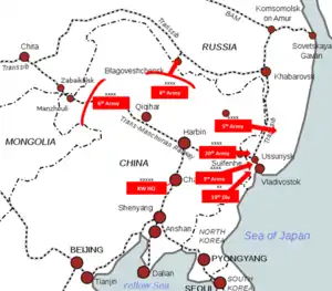 ![]() 圖為日軍展開對蘇戰爭後預想的攻勢路線與欲佔領目標的城市,最終將推進至大興安嶺沿線西側。 | |