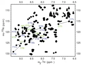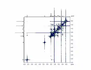在NOESY谱中,混合时的核自旋间的核欧佛豪瑟效应交叉弛豫用于建立NOESY的关联性。这种谱很像COSY,都有着呈对角线的峰和交叉峰,然而NOESY中的交叉峰反映了两个核音的空间距离关系而不是通过化学键相连的关系,NOESY谱中通常还有额外的无用的轴峰,不过可以通过在差异实验中反转第一个脉冲的相来消除。[1]NOESY的应用之一是在生物大分子的研究中,比如可以用NOESY来辅助确认蛋白质的空间信息。通过预先设定单个的共振,NOESY也可以显示一维的谱图,这时通过预设的某个核,可以得到很强烈的负信号,而相邻的核则显示较弱的正信号。这种一维NOESY谱只揭示了那些感兴趣的,且可以测出NOE信号的信,不过所花费的时间要远少于完整的二维NOESY实验。另外,如果预设的核的化学环境随时间变化的话,将会有多个负信号显示,与核磁共振交换谱所给出的交换信息。