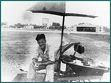 ![]() 阿奇·萊格於夏季在蘭伯特-聖路易斯國際機場值班。他的工作裝備包括了放在獨輪車上的信號旗、掛在傘把上的午餐盒、飲用水、折疊椅以及用於記錄信息的筆記本。 | |