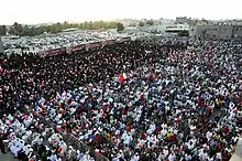 从左上角顺时针方向:埃及首都開羅塔利尔广场的示威者;突尼斯首都突尼斯市的示威者;2011年2月3日聚集在也门首都沙那的示威者;巴林示威者。