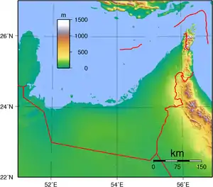 阿拉伯联合酋长国位于阿拉伯半岛东部,地处波斯湾进入印度洋的海上交通要冲。西和南与沙特阿拉伯交界、东和东北与阿曼毗连,北面濒临波斯湾。境内地势低平,境内绝大部分是海拔200米以下的荒漠。仅东北部哈迦山脉地区为山地,哈迦山脉以东阿曼湾沿岸为巴廷纳海岸。全境属于热带沙漠气候,炎热干燥,年降水量仅75毫米左右。