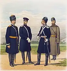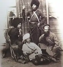 19世紀晚期幾位來自不同哥薩克軍團的官兵,最右邊身著大衣者為阿穆爾軍團的哥薩克