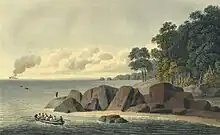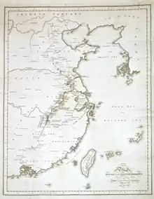 7月13日使团从“红江”岛出发,15日和16日经过大坵島和小坵島,17日驶出台湾海峡,18日行至舟山群岛,21日转向渤海,26日夜停泊在渤海入口的庙岛群岛附近。[77]航行途中,使团内部就谈判内容达成一致,有两点:第一,在北京建立外交使馆,争取建立北京和广州之间的通讯渠道;第二,增加一两个开放通商口岸。[78]在航行过程中,国书的中文译本在7月22日由马礼逊翻译、小斯当东复核交给阿美士德。在抵达渤海之前,使团就在25日派里拉号先行出发向直隶总督传递了使团人员名单和礼物清单,并请求他派出同上次来访相同的船只数量,但是由于大雾无法同亞嘑士地号取得联系[79]。7月28日舰队抵达大沽口,负责传递信息的里拉号在离岸6英里处,而其余船只都在离岸15英里处,里拉号则与几艘中国渔船取得了联系。[80]