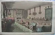 8月13日,使团一行进入天津城内,苏楞额和广惠在天津道衙门口迎接使团,然而在入席之前苏楞额突然提出使团成员应该按照中国礼仪向供奉有嘉庆皇帝牌位的香案行大礼,阿美士德表示会像对自己君主一样向皇帝行礼。苏楞额强调磕头礼,而阿美士德则主张马戛尔尼的先例。苏楞额称当年马戛尔尼也是向乾隆磕头,而阿美士德则称马戛尔尼的报告中称他自己是行英国礼仪,随后苏楞额质问小斯当东,小斯当东则称当年自己年纪尚小、记不得了。[註 5][91]最终,中方做出让步,英国方面按照马戛尔尼的惯例,双方各自按照自己的礼节行礼,中国方面三跪九叩,而使团成员则是免冠3次、深鞠躬9次、起身9次;至于向嘉庆本人所行的礼仪,阿美士德则一再强调马戛尔尼的先例,并且愿意自负责任。[92]与此同时,军机处已经按照嘉庆的旨意制定了使团觐见的严密计划和仪式,在畅想使团行礼的细节了。[93]