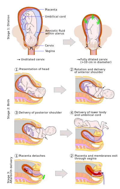 陰道分娩的開始會是子宮的收縮,將胎兒推向產道,進而出生[4],可以分為三階段。