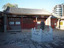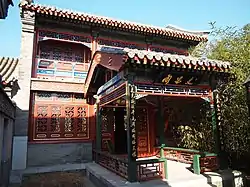 - 山门:坐西朝东。门上的石匾题为“古刹慈悲禅林”,落款为“康熙乙亥”。山门外有一株古槐树,1920年1月18日,毛泽东、邓中夏、罗章龙、萧三及“辅社”在京成员曾在该槐树下合影,这张照片现存首都博物馆。原树已枯,1979年春重新移植。[9]进入山门,可见悬匾刻有“招提胜境”四个大字,似乎是新制。[3]