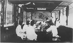 - 周恩来纪念室(五团体会议室):为慈悲庵的北厅,东接文昌阁,西接游廊,位于观音殿正北。此厅坐北朝南,面阔六间,东、西次间分别向南开一门。1920年8月16日,觉悟社、少年中国学会、曙光社、人道社、青年互助团五个团体的20余名代表在此召开联席会议。李大钊、周恩来、邓颖超、郭隆真等人出席。会上李大钊、周恩来等人都作了发言。与会者讨论了各团体联合,共同开展反帝反封建斗争,彻底改造中国社会。此次会议结束后,发表《改造联合约章》及《改造联合宣言》两份文件。此次会议为后来中国共产党的成立在理论、组织、思想上都有贡献。如今屋里恢复了当年开会时的物品摆放情况。西墙上方悬挂一块黑底金字的小匾,上题“陶然亭”三字。匾下有一幅画《刘海戏金蟾》,是清朝画家傅雯在乾隆九年以手指创作的指画。此画两侧挂有张照珏题写的对联:“爽气挹山岚万苇清风带古寺,高踪怀水部一轮明月照江亭。”东墙上悬挂当年开会时的照片,为“觉悟社”社员谌小岑在会议进行时拍摄的照片放大而成。[20]