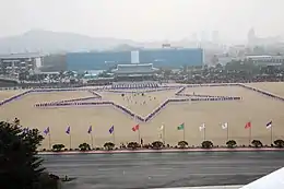 • 花郎练兵场:花郎练兵场建于1958年,是块巨大的草坪,主要用于举行国旗升降仪式和花郎仪式等各种活动,也是学员阅兵式的场地。花郎练兵场的检阅台花郎台外形为传统的朝鲜时期的韩式建筑。[1]:271