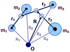 四体问题一个可能的雅可比坐標系。r1, r2, r3为雅可比坐标,R为质心。[2]