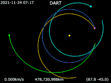 雙小行星改道測試,也称[5][6](英語:,DART)是一项美国航天任务,旨在测试一种针对近地天体(NEO)的避免撞擊方法。该任务将故意使一架空间探测器撞向雙生星的卫星雙衛一(Dimorphos),以测试航天器撞击的动能效应是否能成功使一顆会与地球相撞的小行星偏离方向。空间探测器于2021年11月24日发射,并已于2022年9月26日撞击目標。2022年10月11日,NASA宣布DART任务成功,确认它将雙衛一的轨道周期缩短了约32分钟,超过了73秒的成功门槛。[7][8]