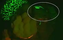 | 索羅門群島夜間 雙線眶棘鱸 的生物螢光 (圈線內) | |