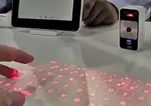 雷射光束投射於平坦表面,形成可見的虛擬鍵盤。手指於雷射投影鍵盤上方移動時,感應器或攝像器會偵測到,進而此座標系統軟體將鑑別為文字鍵、符號鍵或動作鍵。