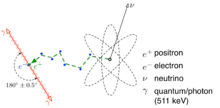 (電子的反粒子)碰撞後湮滅,產生伽马射线或是其他更高能量粒子的過程: