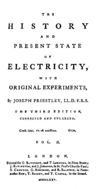 - Priestley, Joseph. The History and Present State of Electricity, with original experiments. London: Printed for J. Dodsley, J. Johnson and T. Cadell, 1767.