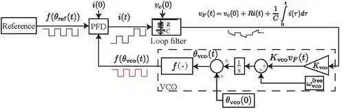 其中是電阻,是電感。 是電容器的電壓。 控制信號會調整VCO頻率: