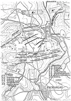 比兩翼所發生的激戰稍晚,奧地利卡爾親王集中中央步兵主力,向普軍支撐點霍图西采小鎮猛攻,利奧波德親王也集中力量死守,吸引奧軍攻勢。上午9點,小鎮在猛攻之下失守,但是普魯士軍隊沒有崩潰,而是稍稍後撤,在鎮外又組織起一條防線,顯示出頑強和鎮靜的素質。在這個過程中,奧地利主力漸漸地被吸引到小鎮周圍,猥集一團,完全沒有察覺到側翼隱蔽的腓特烈所率普軍。10點半左右,當腓特烈看到時機成熟,命令所部23個營步兵向奧地利中央卷擊。普魯士生力軍就像在訓練場上一樣,排著整齊的隊形,和著軍樂鼓點,以縱隊接敵,左轉成橫隊,排槍齊射。在那個單支槍械火力和精確度不高的年代,排槍齊射密集火力的殺傷效果是驚人的,奧地利中央主力受到奇襲,幾乎立即土崩瓦解,再加上迂回戰場的普魯士騎兵的打擊,30分鐘之內,這場戰役勝負已決。普魯士損失7,000人,奧地利損失6,330人(各方資料對死亡人數數字有很大出入),腓特烈獲得了由自己指揮的第一場大戰役的勝利。