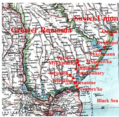 - 比萨拉比亚 – 主要行动区在南部,它将在一支苏联分遣队的帮助下向加拉茨挺进,该支队将越过奥兰内什蒂-普里莫尔西克–图兹拉。这一地区被设置为主要行动区,为此准备了几个弹药库。