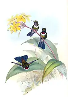 领蜂鸟体重约5.5克,翼长约66.2毫米,嘴峰长约17.1毫米,喙宽度约1.9毫米,喙厚度约1.5毫米,跗蹠长约6.2毫米,尾长约48.2毫米。领蜂鸟在其分布区内为留鸟,其栖息在密集的高大树木组成的森林中,食性为草食性,主要食物来源是植物的花蜜。[3]