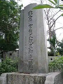 日治時期,北白川宮能久親王曾經在餘三館裡療養,留宿三夜,後來遂在第十七世祖陳捷鰲時以山林土地來交換宅前田地建立神社公園,於昭和九年(1934年)6月落成,而公園內除神社之外還立有「北白川宮能久親王遺蹟碑」。昭和十年(1935年)12月5日,以「湳港西舍營所」的名義與其他的「北白川宮能久親王御遺跡」一起被臺灣總督府指定為史蹟[3]:220[4]:28。二次大戰後陳家將宅前重新闢為水田耕作[1][2],紀念碑本體則被收起來,近年已重新立起。