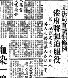 香港強制服役制度,又稱香港兵役制度,是香港通過法例徵召居民服務於軍隊或民防機關的制度。香港開埠至今曾經三次實施徵兵制或強制服役,皆在1841至1997年間的英屬香港時期因應時局而實施[1]。強制服役制度於1917年的第一次世界大戰期間首度執行[2][3],第二次於1939年第二次世界大戰即將爆發前實施[4][5],第三次在1951年的冷戰初期進行[6][7]。在英屬香港時期的強制服役制度僅對具有英國國籍的香港居民施行,其中於1917年及1939年推行的徵兵制,只有適齡的英籍歐裔男性居民被徵召及主要在香港義勇軍服役,這兩次徵兵未有徵召華人參軍。1951年實施的《強制服役條例》,義務役人員除了可被發配到香港防衛軍[註 1],也可被編配到香港輔助警察隊或基要服務團中的後備民防部隊[註 2],1951年起的徵集人員有向香港的英籍華裔居民發出徵召令,當年的第一期服役人員徵集便有900位是華人[9],並且不再局限於男性市民,適齡的女性市民於1953年起亦被徵召,在完成受訓後被委任為特務警察[註 3],或在基要服務團的後備民防隊伍服役[11]。香港的強制服役法例於1961年取消[12],此後到1997年香港主權移交至今,香港居民都不需被強制服役[13]。