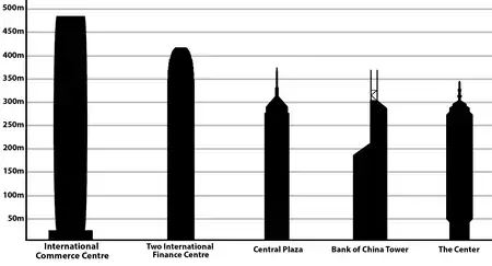 | 1 | 環球貿易廣場 | 484m | 118 | 九龍西九龍 | 2010年 | [6] | |