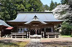 本殿以南約10米處是拜殿,推測建於安永6年(1777年),正面和側面各三間,均是刎高欄切目緣,正面另有一間的唐破風向拜,背面則是五間脇障子,內部是平滑的木地板以及棹緣天井,屋頂在昭和初期是杮葺,後來才改鋪銅板。拜殿以西是建於明治時的神饌所,以南是隨身門,為切妻造八腳門,在元治元年(1864年)動工,於慶應元年(1865年)完工,原本除了隨身像外,還有仁王像,不過由於在明治時實行的神佛分離而轉移至棚倉町內的長久寺。隨身門在結構上以中間為通路,兩旁以木板分為前後兩個部分,前方部分擺放隨身像,並且設有與隨身像的腰部差不多高的金剛柵,中間通路的天井是鏡天井,以墨繪有雲龍,虹梁和頭貫木鼻等圖案繰形由渦紋和雲紋組成,整體主要採用櫸木,屋頂原本也是杮葺,1960年時才改鋪銅板[15][11]。此外,尚有建於昭和初期的社務所以及寅卯神社、鹿島神社、稻荷神社、嚴島神社和日枝神社等末社[11][15][8],另外境內也有一座名為馬場古墳的古墳[2]。