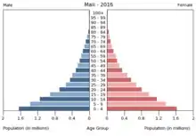 2018年,马里人口估计为1,910万,[1][2]年增长率为2.7%,[3]而1950年人口仅为463.8万。[4]马里以农村人口为主(2002年占比为68%),5%-10%的人口是游牧民族。[5]超过90%的人口居住在该国南部,尤其是巴马科,有100万人口。[6]