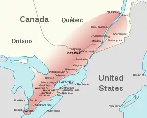 这片区域从魁北克市沿着圣劳伦斯河北岸、安大略湖和伊利湖延伸到温莎市,经过许多加拿大的重要城市: