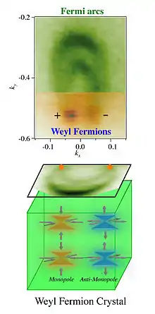 美国物理学家康耶斯·赫林在能帶結構固態系統下首先預測魏尔費米子的存在[1][2][3] 。鉭砷晶體是第一個發現魏尔費米子存在的晶體結構[4]。帶電魏尔費米子在室溫下穩定存在。
