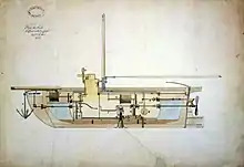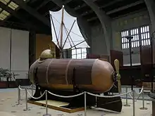 首先其主結構就像是一個木製大酒筒,在其前上方有個小型指揮塔兼出入口,其船尾有個雙葉螺旋槳,由4個人搞動,船內的壓縮空氣瓶能供氧4.5小時,內裡會點蠟燭,這除了照明的需要,還是告知有否缺氧,因為一旦蠟燭息滅就要上浮。