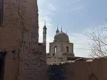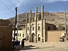 吐峪沟村北清真寺(也被称为艾苏哈卜·凯赫夫清真寺)占地3000平方米,清真寺主体是礼拜堂,坐西朝东;清真寺院落则是按南北方向建设,院内敞扩。清真寺整体以绿色维护,南面是左右对称传统清真寺布局,有穹窿圆顶,南立面矗立有四座封闭结构的邦克楼,表面有简单几何图案的彩绘。[刊 5][刊 6][书 6]