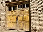麻扎村民居的建筑大多以土黄色的本色为主,建筑外立面唯一彩色部分是较新的门扇,色彩以绿色、红色、黄色、蓝色、白色为主,有些门扇有绘制的彩色图案。麻扎村民居门扇早期以简约的挂锁木门为主,原材料以桑木、松木为主,早期多以木本色为主。民居大门下有门槛、上有门框。民居建筑主门框设置有木雕库巴,也被称为门当或户头。木雕样式包括花卉形状、几何图形、果实图形、太阳星星图形等。一些民居宅内的小门也有库巴木雕。过去可以通过库巴判断民居主人的身份:果实、花卉的形状代表着户主经商,几何形状则代表户主从仕。[书 1]:39-44[书 3]