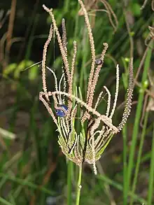 总花梗长、多年生,分枝3-6,短,每个分枝上有数个合轴的肉穗花序并列生长,佛焰苞不明显;小花两性,具花被,花瓣4片,雄蕊4枚;子房长椭圆形、1室、胚珠1,柱头小。