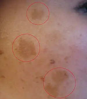 黄褐斑(chloasma[1][2])又称面部黄褐斑(chloasma faciei[3])、肝斑、黑斑病(melasma[4])、黑皮病[5],是一种皮肤颜色变深为黄褐色的疾病,发生在孕妇身上时候被称为妊娠面斑(mask of pregnancy[6])或孕斑。