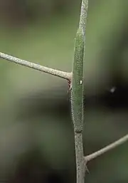 幼蟲的寄主為白花菜科(Capparaceae,又稱山柑科)中山柑屬(Capparis)的植物,包括廣州槌果藤(C. cantoniensis)、長刺山柑(C. henryi)、黑葉山柑(C. sabiaefolia,又稱毛瓣蝴蝶木)、蘭嶼山柑(C. lanceolaris)、野香櫞花(C. sbodinieri)等植物,取食部位為新芽及幼葉之葉片。[3][4][6]
