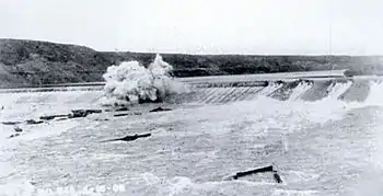 1908年4月14日,下午2:30左右,大瀑布上游90英里處的豪瑟水壩潰堤[62],高25英尺(7.6)到30英尺(9.1)的浪潮襲捲下游[63]。大北鐵路指派一台火車頭沿路警告住在通往大瀑布城的鐵路周邊居民[64]。礦業公司的工人簡易地搭建了一個翼壩,以從冶煉廠轉移洪水,並炸開了一部分的黑鷹水壩以利洪水迅速流向下游[65][66][67]。但當河水到城市時,密蘇里河只漲潮了7英尺(2.1)[68]。有兩名員工在爆破時身亡:一位在移除水壩的插板時溺死,另一位死於船隻翻覆。