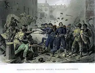 ![]() 马萨诸塞州民兵穿越巴尔的摩, 1861年一幅描述巴尔的摩暴乱的雕版画 | |||||||