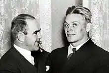 爱沙尼亚选手奥古斯特·尼奧(左)和克里斯蒂安·帕卢萨卢在1936年奥运会上古典式和自由式摔跤比赛中均获得奖牌