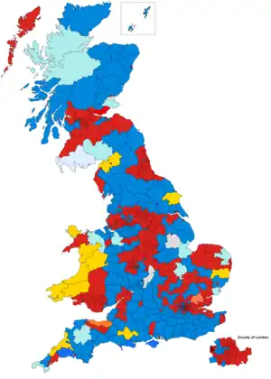 ![]() Colours denote the winning party, as shown in the main table of results. (Insert shows results in the Parliamentary County of London. Map excludes Northern Ireland) | |||||||||||||||||||||||||||||||||||||||||||||||||||||||||||||||||||||||