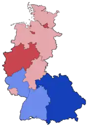 ![]() 各州選舉結果,深紅色區域代表社民黨得票絕對多數,粉紅色區域代表社民黨得票相對多數。深藍色區域代表基民盟/基社盟得票絕對多數,淺藍色區域代表基民盟得票相對多數。 | |||||||||||||||||||||||||||||||||||||||||