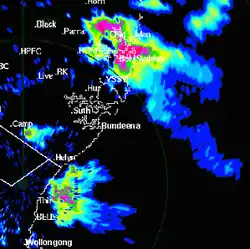 1999年悉尼雹暴的风暴单体于澳大利亚时间4月14日下午16点25分在诺拉以北,悉尼西南偏南方向约115公里上空形成。风暴形成后起初向东北方向的海岸线前进,其单体于下午17点15分左右经过凯马,澳大利亚气象局这时将系统归类为“强烈”雷暴。[15]该组织对雷暴强度有专门的分级,“强烈”便是其中一个级别,这一强度雷暴可以产生直径大于或等于2厘米的冰雹,阵风时速至少90公里,还有可能引起山洪爆发或龙卷风。风暴存在期间无论在何时达到相应强度,澳大利亚气象局都有可能用这一分级来为其分类。[7][16]